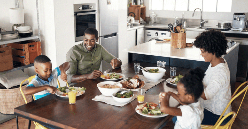 Sit around the table as a family to help create a safe and comfortable environment for the child.